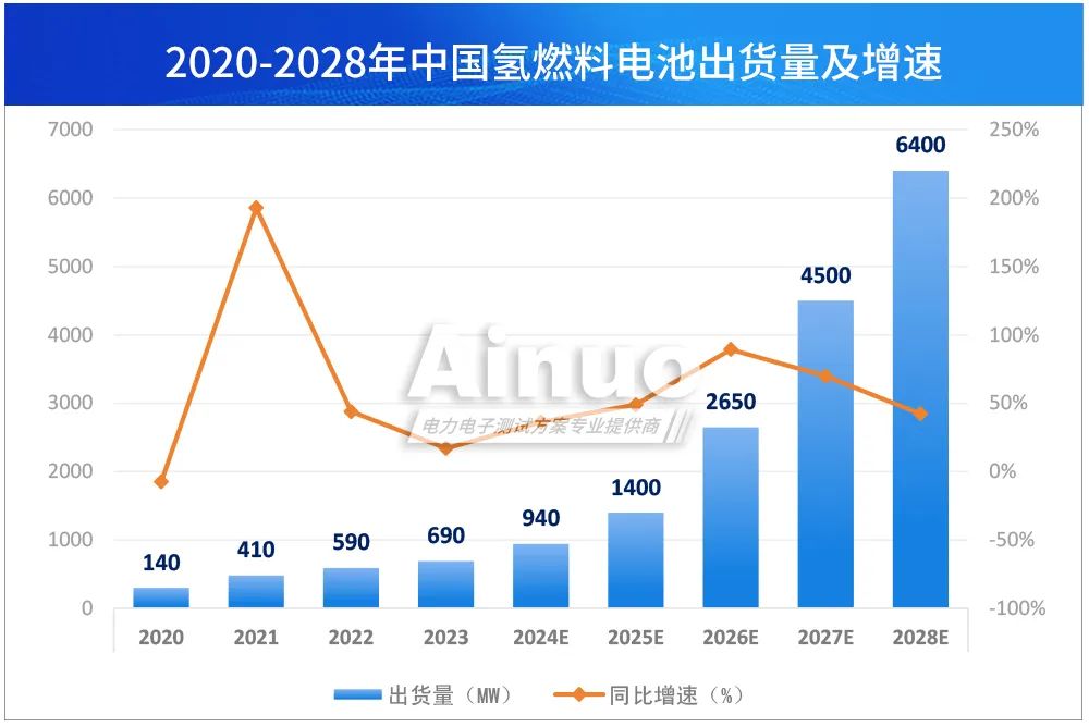 在双碳背景下,国家发改委、国家能源局联合出台《氢能产业发展中长期规划(2021-2035年)》 指出将重点推进氢能及燃料电池汽车产业低碳化发展。据SPIR数据显示,2023年我国氢燃料电池出货量为690MW,预计至2028年出货量将达6400MW,年均复合增速40%。