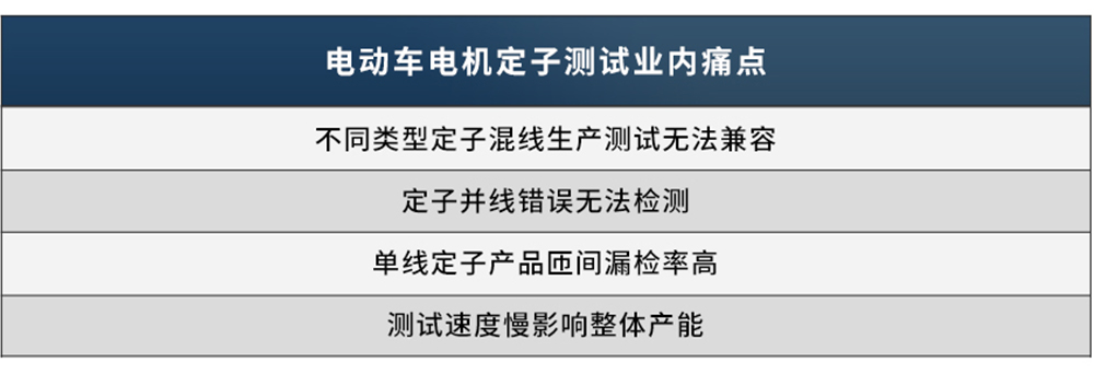在电动车电机实际生产操作过程中,传统方式的人为检测无法保证每道工序的一致性和实际合格率,并且存在诸多测试方面的痛点,因而综合性能自动化测试,在电动车电机定子的工艺闭环生产流程中格外重要。