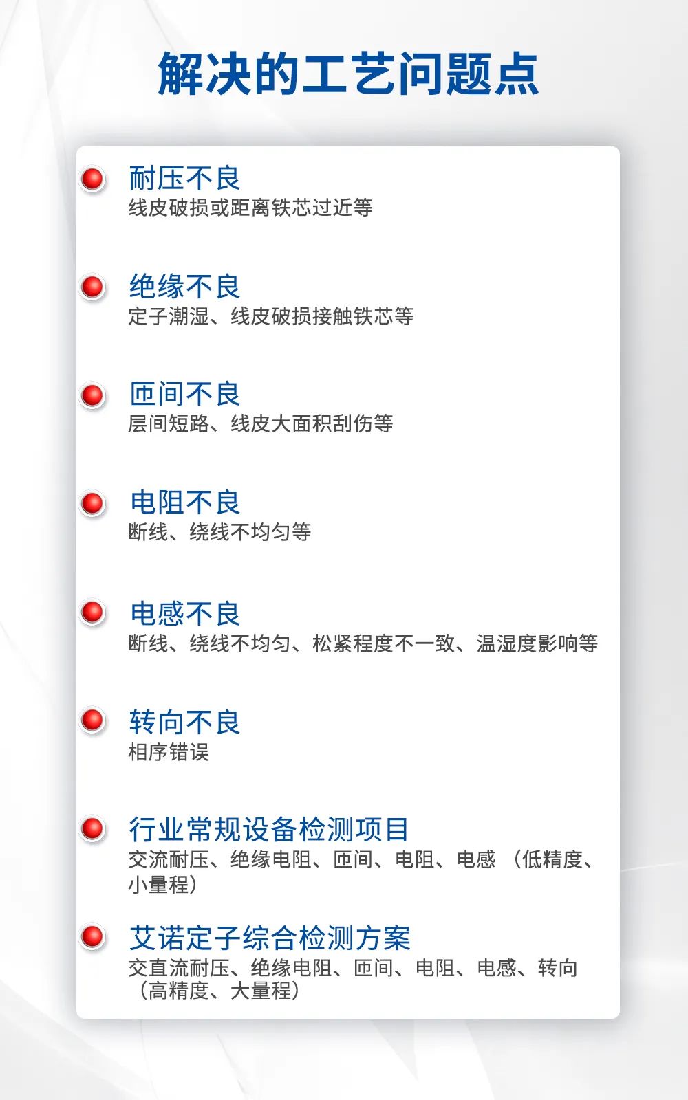 伺服电机在生产过程中,须经过严格检测,确保出厂各项测试指标均符合标准。根据GB/T 39553-2020《直流伺服电动机通用技术条件》及GB/T 7344-2015《交流伺服电动机通用技术条件》,伺服电机厂商在工艺闭环检验中,进行定转子综合性能测试、控制器测试、伺服整机综合性能等测试。而测试期间面临,匝间测试精度不足、重复性差、电阻测试偏差、无大绝缘能力和相序测试不稳定等行业痛点。