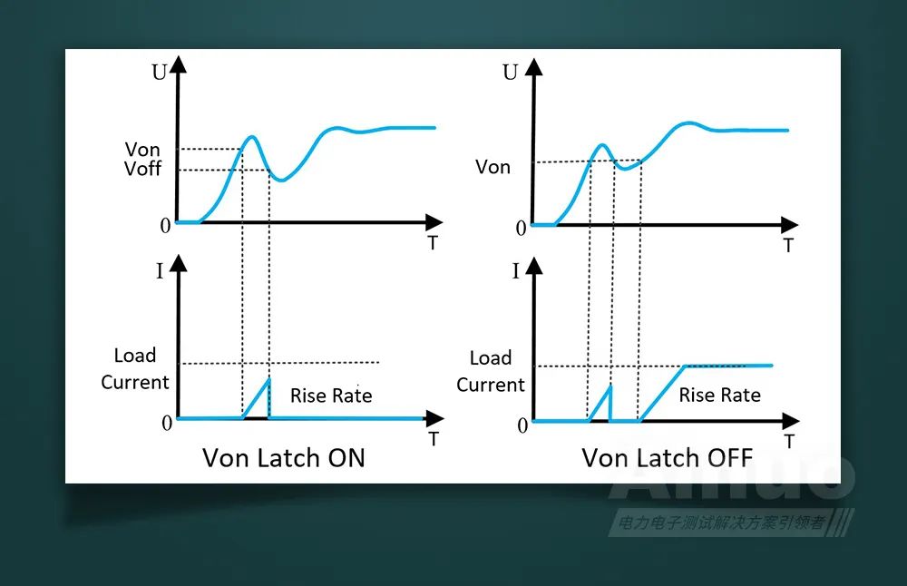 如上所述,其中工况5为测试最严苛工况。继电器闭合瞬间,经常会出现CR/CP带载模式时炸机,从而损坏电子负载或者电源。为了适应这类使用工况,艾诺电子负载设计了Von Latch功能,设置拉载门槛电压,当电压高于Von值后,负载开始起载,使继电器几百万次开合试验都正常使用。