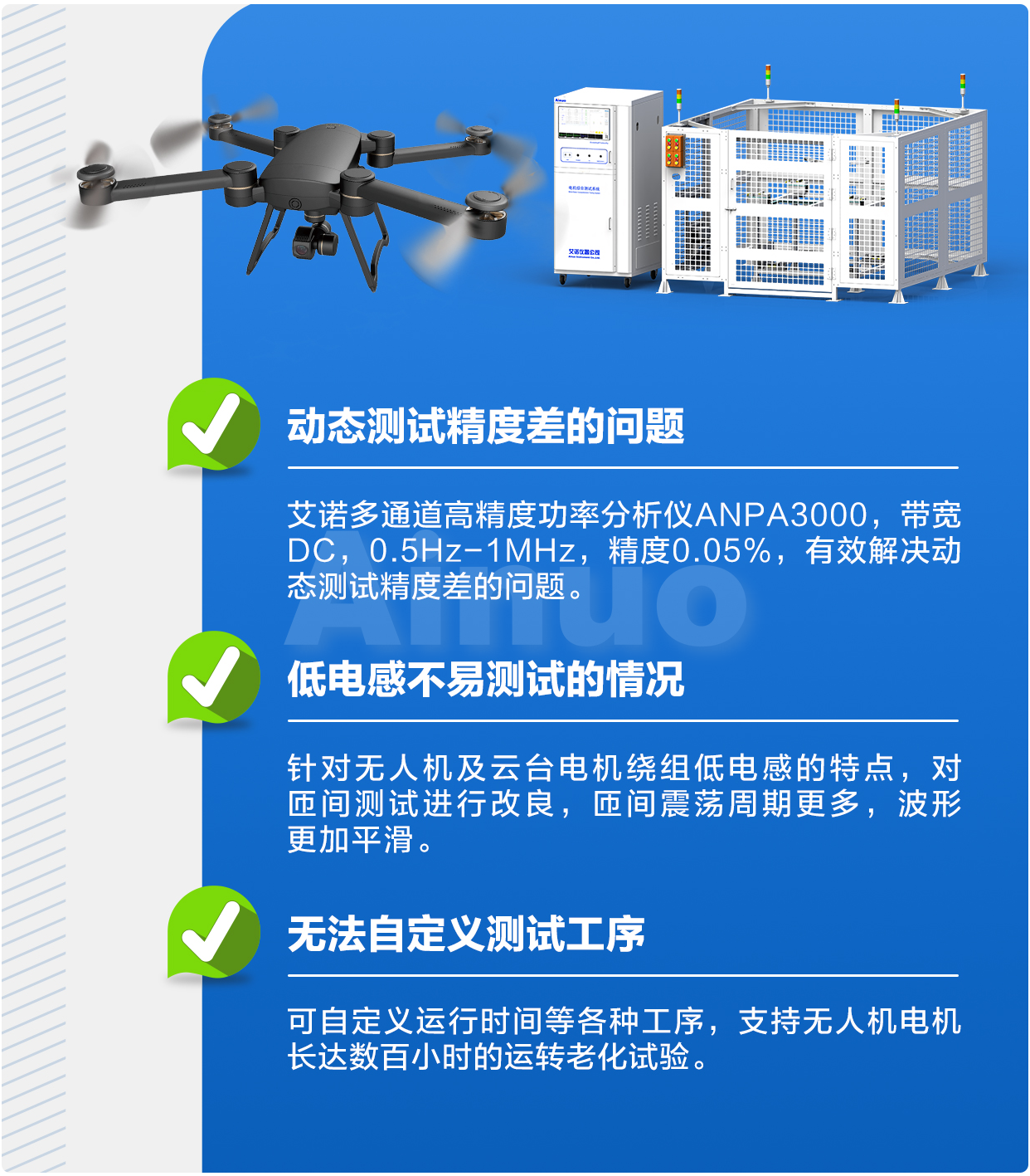 针对无人机电机行业的测试需求,艾诺公司充分利用自身技术积累,推出的无人机电机测试方案AN8AYX系列产品,旨在为客户提供精准且可靠的测试数据,有效应对无人机电机测试中的行业难点。在众多客户的产线测试应用,并获得了广泛的认可与赞誉。