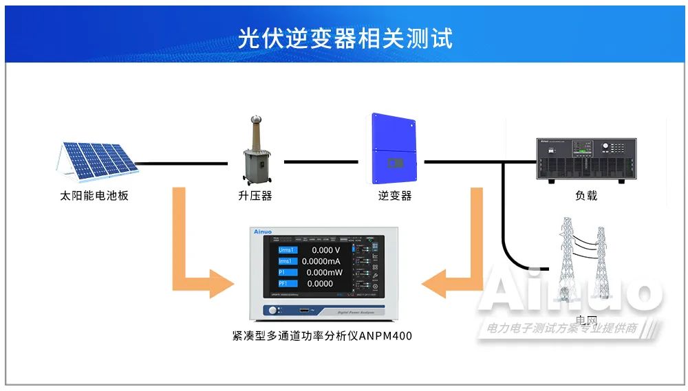 艾诺仪器深耕测试行业多年,了解光伏逆变器应用中的痛点,为之专项研发推出的紧凑型多通道功率分析仪ANPM400。采用了高速FPGA+ARM处理器双核处理,具有电力数据分析、谐波分析、效率计算、波形显示等功能,能够准确地分析和测量光伏网络中的相关参数,可以大幅提升研发生产流程的检测效率。
