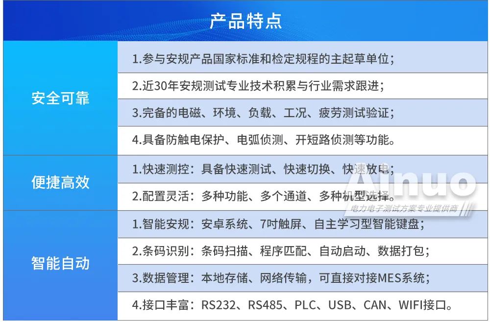 艾诺光伏智能安规综合分析仪PVS系列,具有智能化、高速度、高精度的特点,功能包括交(直)流耐压、绝缘电阻、交(直)流接地测试,以及电弧侦测、开短路侦测、触电防护等多种功能组合。系列产品可满足光伏组件、逆变器、开关电源、电驱、充电桩等各类具有交直流输入和输出特点的电气产品的安规测试需求。