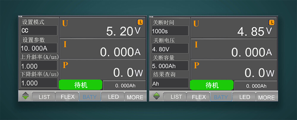 首先可设置定电流、定电阻、定功率三种区别模式进行电池容量测试。在电池测试模式下可编程设置关断时间、关断电压、关断电容量作为中断电池测试的条件,三个参数彼此独立,满足其一,系统将中断拉载,并显示关断时条件。其中关断电容量可设置为0(Ah/Wh),则负载将只以关断时间、关断电压作为判断条件。测试过程中,可观测电池的电压、放电电流,负载功率、电池已放电容量、电池放电时间。
