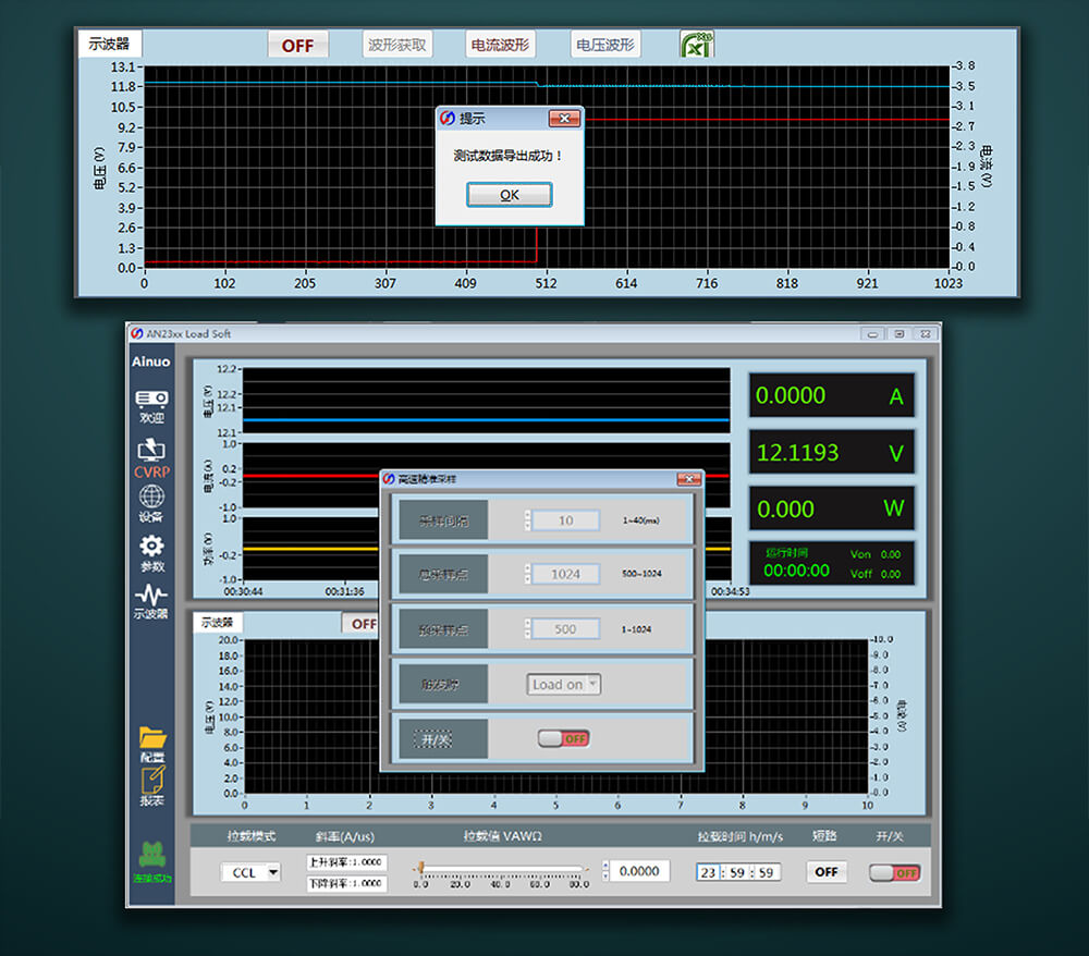 此外电池调试验证中,需要某一触发时段电压电流波形数据,用户可以使用电子负载AN23600E的数据采集功能,配合触发源启动抓取瞬间电压、电流的数据,使用上位机软件将数据点绘制成波形呈现,并导出测试excel数据。