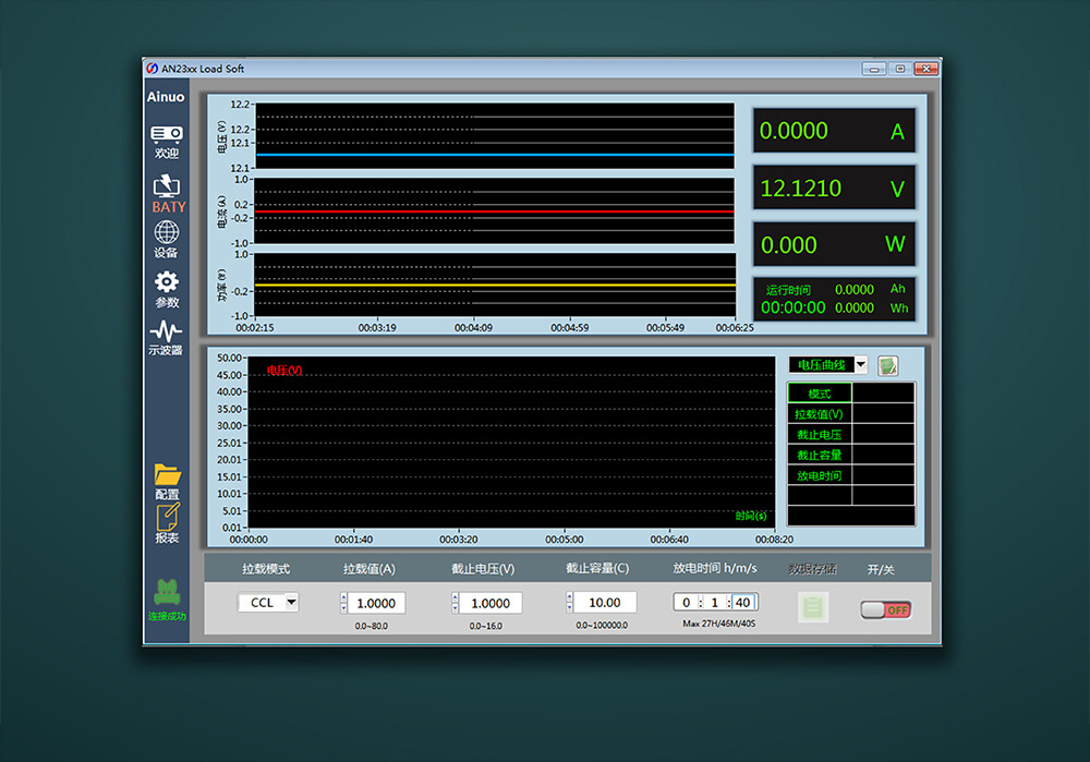 动力电池放电测试,关心电池的容量、放电时间、截止电压,过放保护;