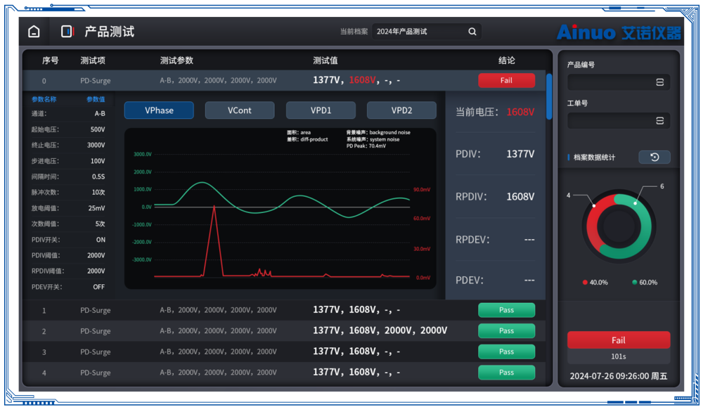 AN8A10-PD系列具备高性能、高可靠性、提供独家UHF计量检测方案等优点,同时支持高检出率匝间、匝间PD (DC-PD) 和高检出率耐压、耐压PD (AC-PD)、集成通道切换,一次接线自动完成全部测试、可测试电性能、PDIV、RPDIV、 PDEV、RPDEV及对应电压-放电相位图等功能。