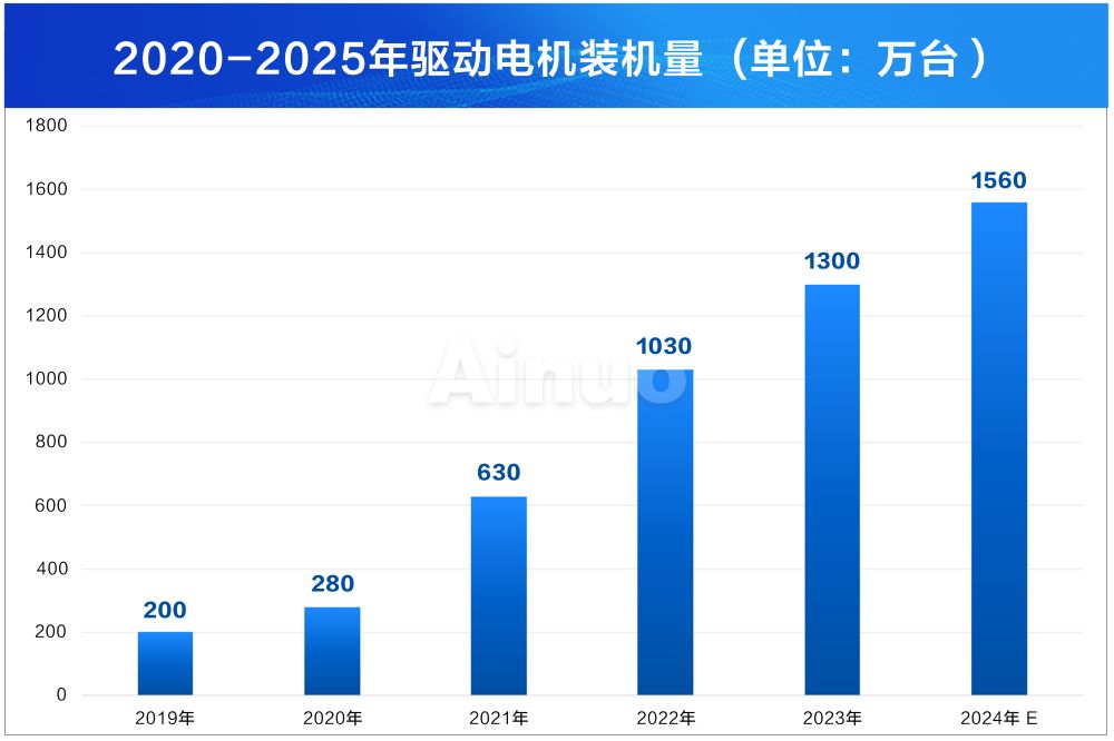 受双积分等环保政策及技术进步影响,新能源汽车渗透率持续提升,相应的驱动电机市场将迎来黄金增长期。预计到2025年,中国驱动电机需求量近1157万台,市场规模为313亿元,年增速达24.2%。