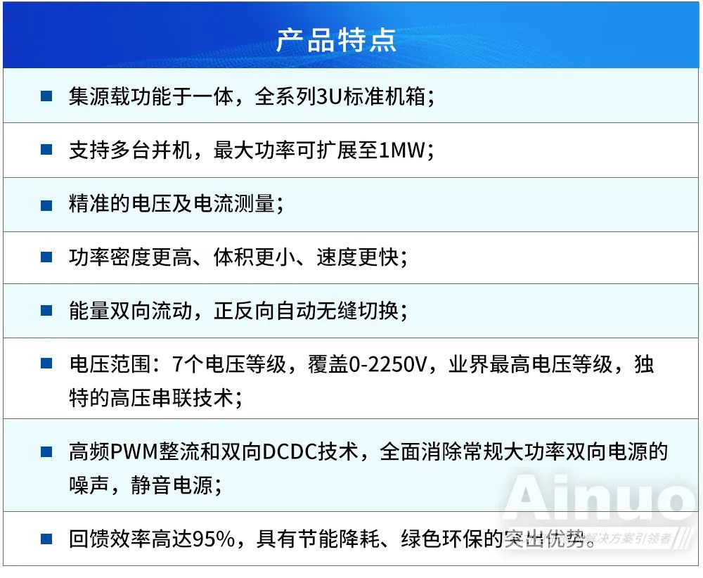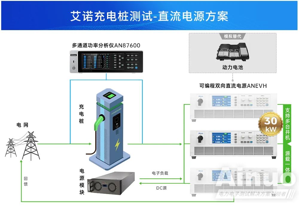 艾诺仪器深耕测试行业多年,深度了解充电桩测试中的痛点,为之专项研发推出了可编程双向直流电源ANEVH系列解决行业难点。以业界主流的150kW 直流桩(15kW模块*10)测试为例:测试单个15kW电源模块时,采用两台双向源载一体ANEVH电源,一台作为直流源模拟前级电路的输出,对后级电路供电测试。另一台作为电子负载模拟电池包吸收电流测试后级电路的输出情况,并作为回馈式负载回馈电网,回馈效率高达95%,大幅降低测试成本。
