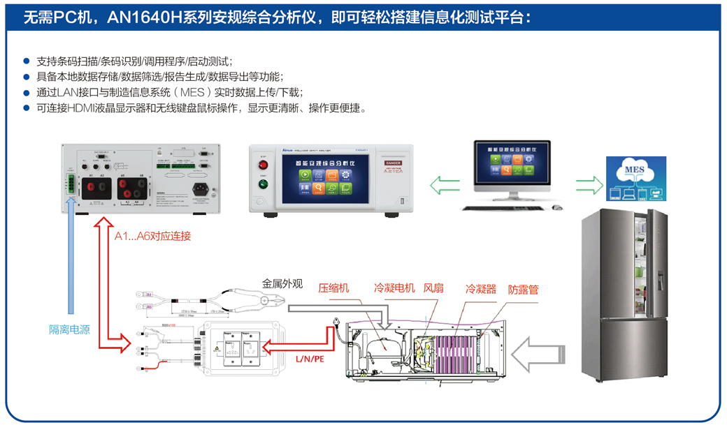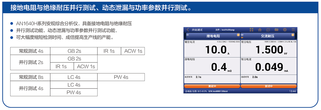 艾诺仪器公司专注安规测试仪器研发30多年,参与起草了16项安规仪器国家标准和行业检定规程。AN1640H系列智能安规综合分析仪,具有“全功能、高精度、高速度,自动化、信息化、智能化”等特点,满足单相和三相家用电器、充电桩等类似电器产品生产线的快节拍、多品种、信息化的安全性能综合测试需求。