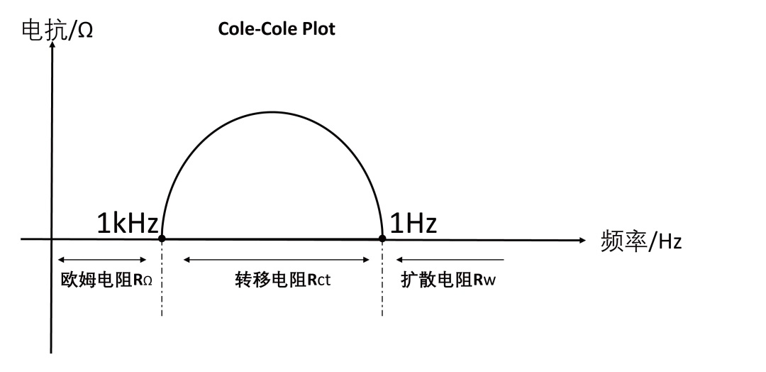 由上图可知,电路原理简化为:DCIR=RΩ+Rct+Rw,ACIR=RΩ,EIS为宽频的复阻抗,EIS需要在复数域进行测量,回路带载正弦波形,频率范围0.01Hz-20kHz,峰值几十安培到几百安培,通过绘制cole-cole曲线得到EIS值。