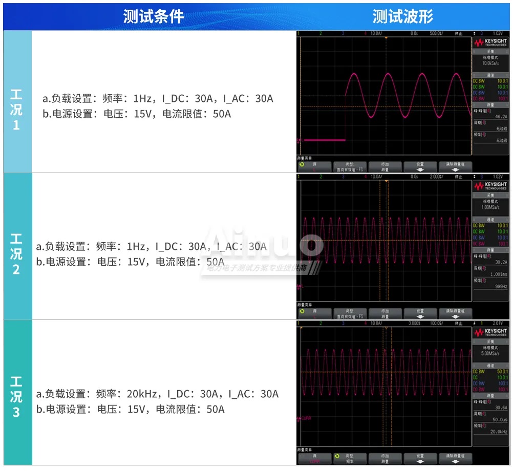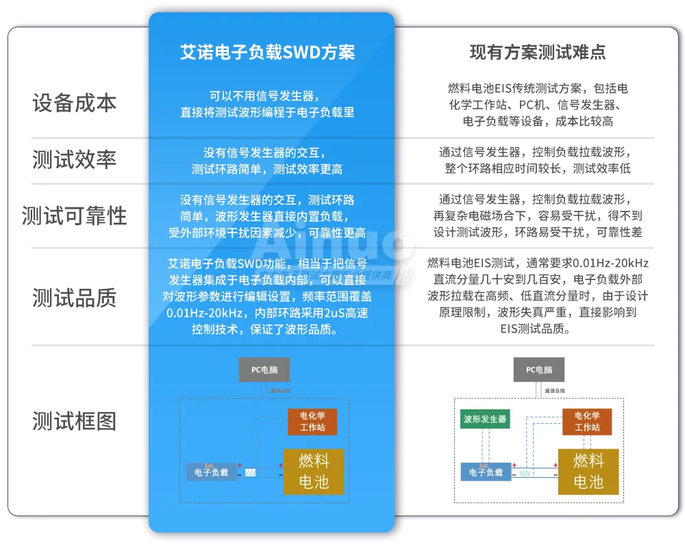 燃料电池EIS测试需要用到波形发生器、电子负载、电化学工作站等多种测量设备。根据实际燃料电池测试需求,通过波形发生器产生小幅正弦电势信号,结合电子负载外部波形拉载功能,控制回路实际正弦拉载波形,电化学工作站进行中控与分析,最终得到EIS测量值。这个测试方案中,存在设备成本较高、测试效率低、可靠性差、测试品质一般等情况,目前艾诺仪器大功率直流电子负载AN23600E系列有针对性的推出SWD模式功能,有效的解决了行业难点,具体对比分析如下图所示: