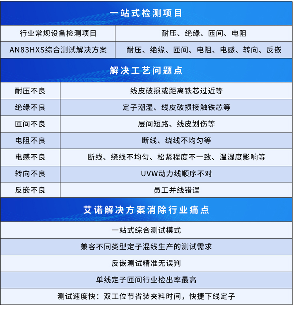 在电动车电机实际生产操作过程中,传统方式的人为检测无法保证每道工序的一致性和实际合格率,并且存在诸多测试方面的痛点,因而综合性能自动化测试,在电动车电机定子的工艺闭环生产流程中格外重要。