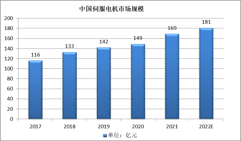 近年来,我国工业机器人及电子制造设备产业持续扩张,作为上游的伺服电机,应用规模随之不断增长。2021年中国伺服电机市场规模达169亿元,同比增长13.42%,预计2022年将增长至181亿元。