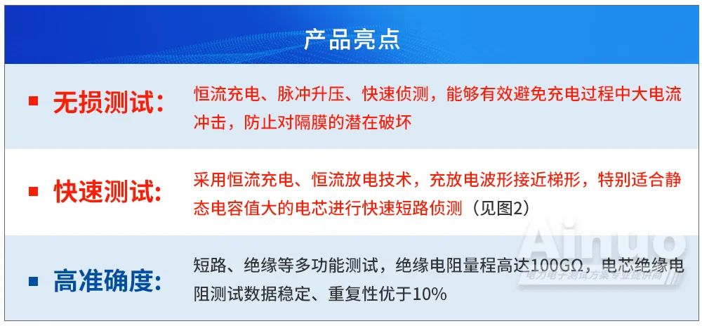 艾诺锂电池电芯短路测试仪ANBTS7201系列,结合传统电芯短路测试仪的优点,可实时监测充电放电过程中的电芯端电压跌落幅度,不仅能检测出电芯正极、负极、壳体之间的绝缘性能失效产品,并且能分析侦测出电芯内部存在的金属异物、隔膜褶皱、微穿孔、边沿毛刺等微短路工况;结合艾诺恒流充放电技术,大大提升了大容量电芯的测试速度,专业应用于储能、动力电池等大容量锂电产线的短路测试。