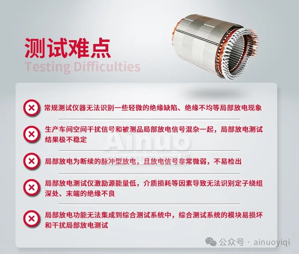 随着驱动电机行业向高压、高频方向的发展,电机内部局部放电的隐患显著增加。虽然其放电的强度较为微弱,难以察觉,但长期累积会加速绝缘老化,最终将导致匝间短路,缩短电机使用寿命。因此驱动电机厂家,对产品局部放电的检测日益重视。