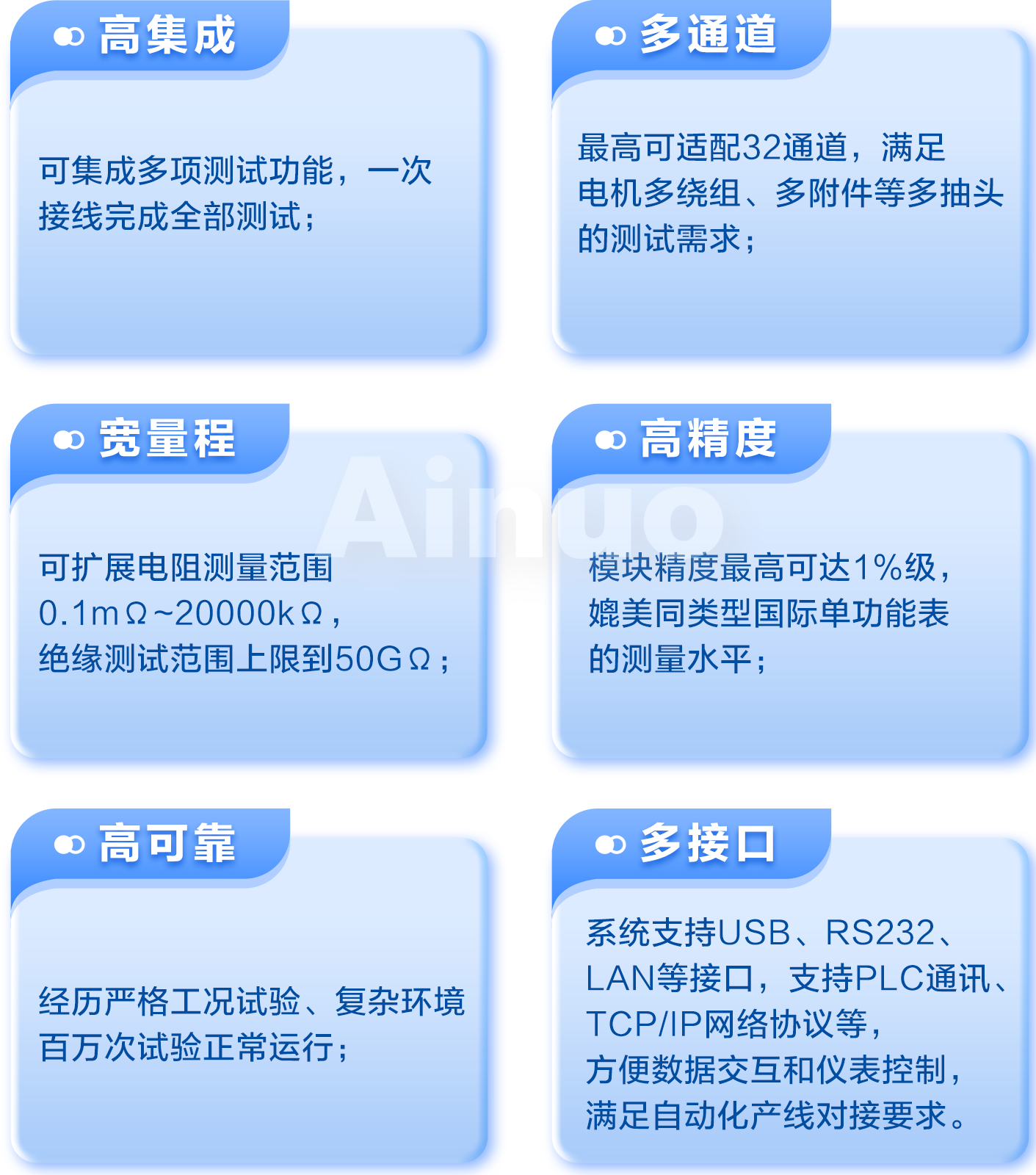 无人机电机测试方案AN8AYX系列具备高性能、高可靠性等优点,同时支持全自动化产线与人工产线、集成通道切换,一次接线自动完成全部测试、可测试交流耐压、直流耐压、绝缘电阻、匝间测试、直流低电阻、电感、垂线、转速、转向、空载、负载、噪声、老化测试等功能。