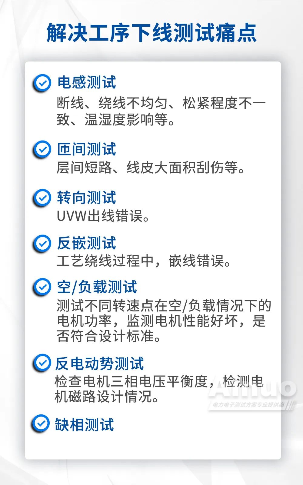 随着无刷直流电机整体应用市场规模的增长,我国陆续颁布标准及规范,加强安全要求,提升生产工艺。电机厂商在生产过程中,从定子到组装成品的每道工序,都须对电机定子/整机进行严格的检测。在早期筛选出匝间绝缘不良的电机,将大幅降低电机使用过程的故障率,提高出厂电机的安全性和可靠性。