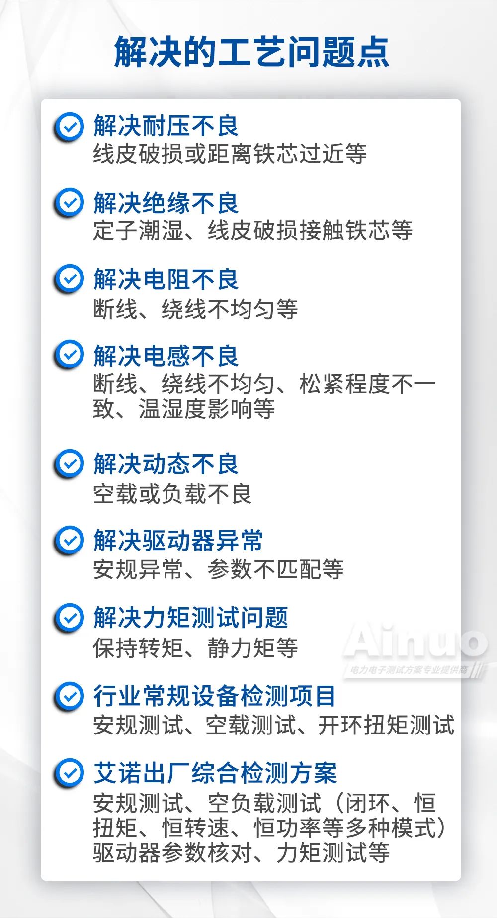 伺服电机测试方案AN83FX系列针对两相、三相、多相等伺服电机定转子,具有耐压(绕组-壳、绕组相间)、绝缘(绕组-壳、绕组相间)、电阻、电感、反电动势、空载测试、负载测试、驱动器测试、力矩测试等多项功能。 结语 艾诺伺服电机测试方案AN83FX系列,通过在伺服电机半成品和成品检测中,出色的检测精度及品检效率,获得国内外众多知名电机厂商和主机厂商的赞誉。伴随着工业自动化的飞速发展,伺服电机市场将迎来更广阔的发展前景。品质工艺要求进一步提升,AN83FX系列必将为伺服电机行业检测提供更大助力。