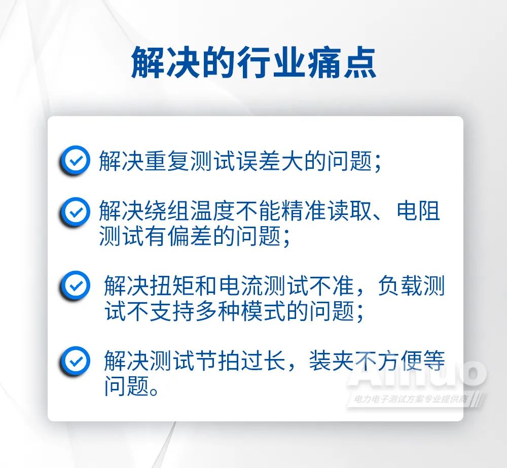 解决方案 艾诺仪器30年来通过自主创新,研发推出专业电机测试解决方案。其中伺服电机测试方案AN83FX系列,已升级更新至第四代,通过长年与伺服电机头部企业合作,结合实际产线应用经验,产品获得业内客户的一致好评。