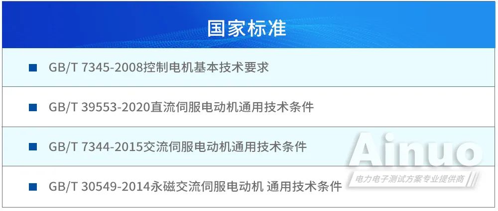 近年来我国出台了一系列政策,大力推动和规范伺服电机行业的健康发展。其中2021年12月,工信部、发改委多部门联合下发了《“十四五”机器人产业发展规划》。该规划特别强调了优化高性能伺服驱动控制技术、伺服电机结构设计制造工艺及自整定技术。旨在推动高精度、高功率密度的机器人专用伺服电机电控核心部件的研发。 应用需求 伺服电机是一种精确运动控制的执行电动机,在伺服控制系统驱动控制下,实现电动机轴上的扭矩、角速度或角位移输出。在生产过程中,需要对各项技术指标进行严格的检测,确保出厂时在各种工作状态下正常工作。因而伺服电机在生产过程中,定子,转子,控制器、整机等的每一道工序的工艺要求非常高。操作员工或自动化产线在运作过程中,难以保证每一道工序的零部件合格率,所以定转子综合性能测试、控制器测试、整机综合性能测试成为生产过程中一道非常关键的工序。 1. 国家标准