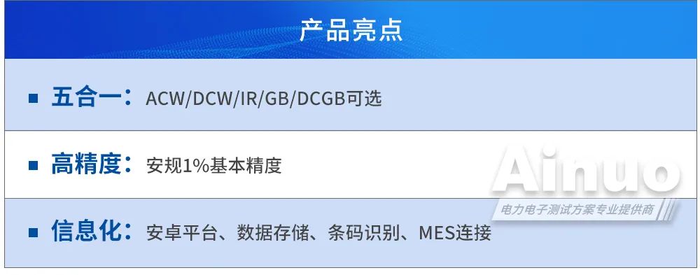 艾诺光伏智能安规综合分析仪PVS系列,具有智能化、高速度、高精度的特点,功能包括交(直)流耐压、绝缘电阻、交(直)流接地测试,以及电弧侦测、开短路侦测、触电防护等多种功能组合。系列产品可满足光伏组件、逆变器、开关电源、电驱、充电桩等各类具有交直流输入和输出特点的电气产品的安规测试需求。
