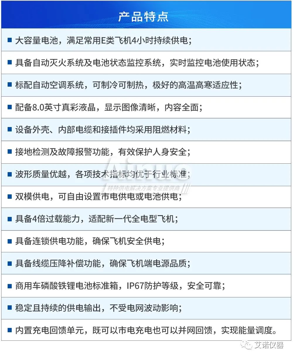 艾诺仪器秉持绿色发展的产品设计理念,推出新一代动力电池供电的飞机地面供电设备AN17ES系列储能式飞机地面静变电源,采用先进的高能储能电池及管理系统,配合全球领先的地面静变电源技术,完美适配所有400Hz供电的飞机机型。作为APU替代地面电源,真正实现机坪零污染,零排放。